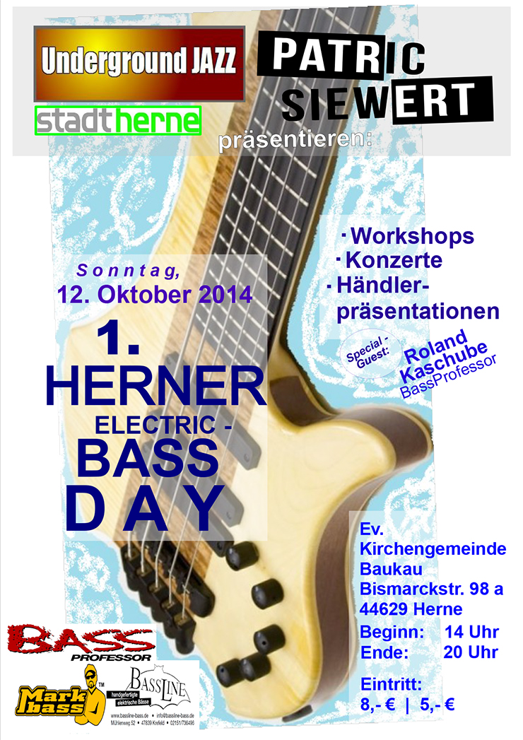Liebe Freunde der tiefen Saiten, seit mehr als 20 Jahren lassen mir die tiefen Saiten meiner Bassgitarre nun schon keine Ruhe mehr. Von 2003 – 2007 studierte ich das Fach E-Jazz -Bass an der ArtEZ in Enschede (NL). Damit habe ich den Grundstein für meine musikalische Laufbahn gesetzt. Das ich heute als E-Bassist mit meiner aktuellen Band meinen individuellen musikalischen Weg bestreiten kann, ist für mich eine Bestätigung dafür, dass sich der Einsatz für mein Instrument gelohnt hat. Am Sonntag dem 12. Oktober 2014 freue ich mich Euch zum ersten Electric Bass-Day nach Herne einzuladen zu dürfen. Die Durchführung dieses Event gelang mir und meinem langjährigen Manager Carsten Stoll im Rahmen unser Konzertreihe Underground Jazz-Herne. Und Dank der Mithilfe der Firmen BassLine – Krefeld und MarkBass (für die ich als Endorser tätig bin) sowie Roland Kaschube dem Herausgeber der Zeitschrift Bass Professor. Das Programm des ersten Herner Electric Bass-Day versucht jeden Bassisten und Musikinteressierten die Welt des E-Basses näher zu bringen: