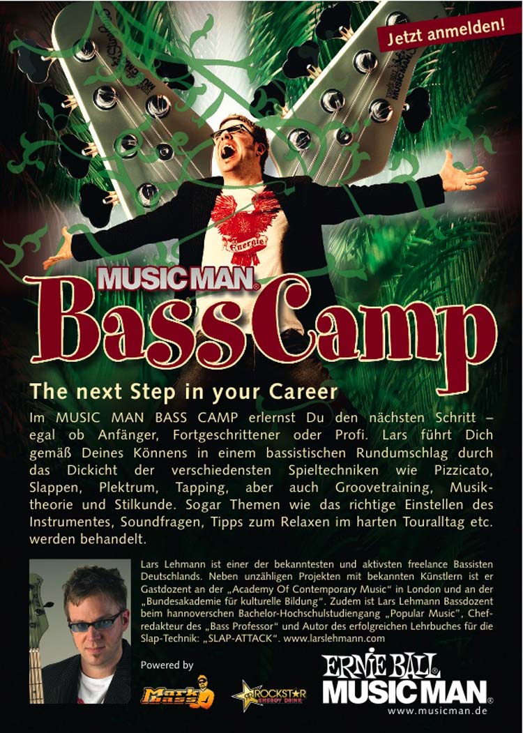 Lars Lehmann und sein MUSIC MAN BASS CAMP – am 15. Juni im MUSIC COLLEGE in Hannover und am 22. Juni 2013 bei SESSION MUSIC in Frankfurt! Wer schon einmal an einem BASS CAMP teilgenommen hat, der wird Lars’ Spontaneität, Vielseitigkeit und guten Humor noch in guter Erinnerung haben.