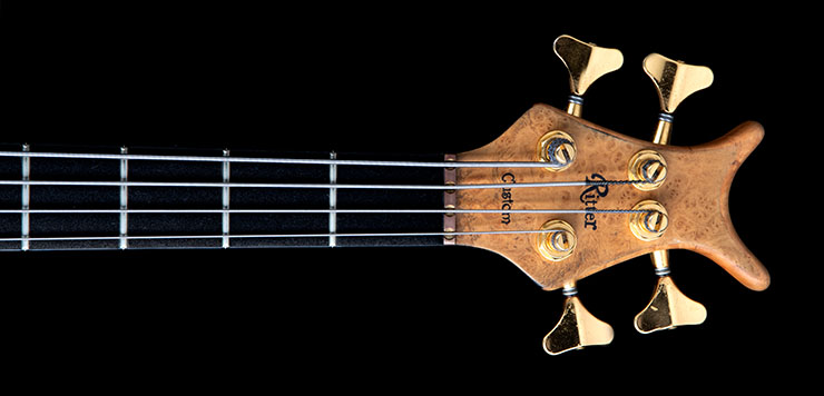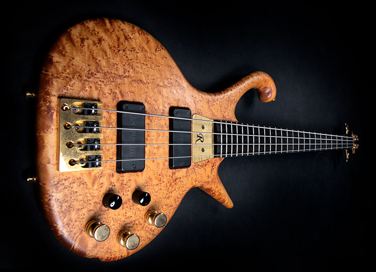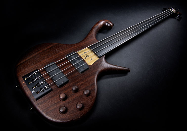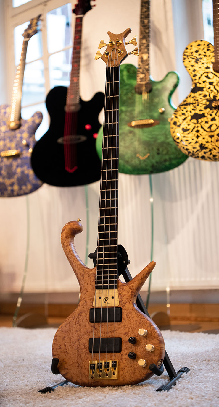 Bevor ich zum Interview komme, vorab ein paar Infos zu den Bässen: Für den Body des bundierten Viersaiters kam wunderschönes Vogelaugenahorn zum Einsatz. Durch vielfaches Beizen in einem violetten Farbton, Teilabschleifen und Wachsversiegeln bekam der Bass ein an Marmor erinnerndes Finish. Der sechsfach verschraubte Kohlefaserhals mit Phenolgriffbrett und 24 Jumbobünden wurde seinerzeit von SKC Bogart geliefert, wobei die Ritter-charakteristische Kopfplatte auf die sperrspitzenartige Grundkonstruktion durch Anleimen von Vorder-, Hinter- und Seitenholzteilen geschaffen wurde. Die Fretlessvariante hat einen einteiligen Padouk-Body und besitzt die gleiche individuelle Form wie sein bundierter Geschwisterbass. Das Shaping des Oberhorns erinnert mich an eine Schneckenform, wie man sich von den klassischen Streichinstrumenten kennt, wobei das gradlinige Unterhorn einen optisch gelungenen Gegenpol schafft. Sowohl am Gurt als auch im Sitzen sind die Instrumente dank der Shapings mit der schlanken Taile und der flachen Hälse topp bespielbar. Sehr schön anzusehen sind die eingelassenen Messingabdeckungen mit Ritterlogo am Halsende, sowie die hölzernen Potiknöpfe. Mechaniken und Brücke sind Spitzenvarianten aus dem Hause Gotoh und ETS. Die passiven Tonabnehmer der Bässe sind von Bartolini, die per Überblendregler mischbar und durch einen zuschaltbaren aktiven Dreiband-EQ ergänzt werden können. Abgerundet wird die Kontrolleinheit durch einen Mastervolumenknopf, der per Zugschalter den EQ deaktiviert. Klanglich überzeugen die Bässe durch eine sehr feine und sensible Ansprache mit gesundem klarem Ton, der sicherlich aus der Kombination des Kohlefaserhalses mit den verwendeten Hölzern herrührt. Dirk Groll hatte im Jahr 1996 das Vergnügen, die beiden Bässe in einem Testbericht bei Gitarre & Bass vorzustellen und resümierte, dass er kaum glauben konnte, dass es sich um Prototypen handelt, da die Qualität für Erstlingswerke viel zu hoch sei.
