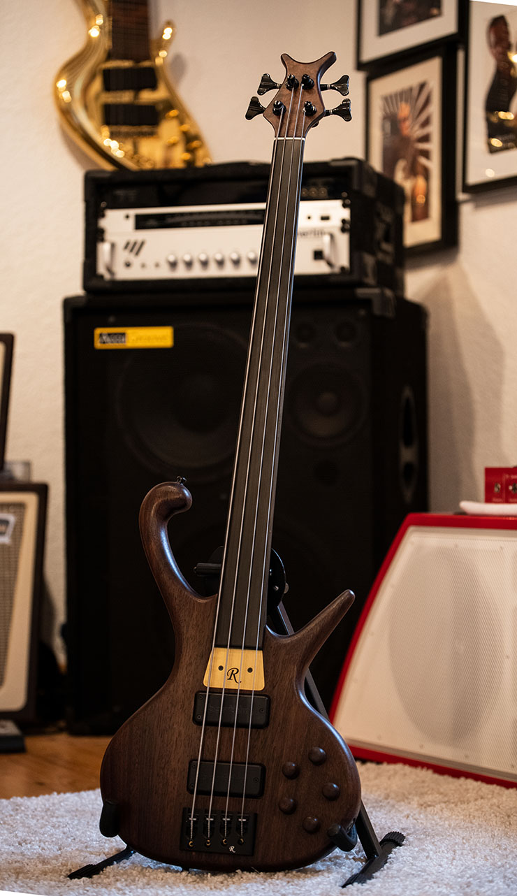 Es handelt sich bei diesem exzellenten Pärchen um eine Fretless- und eine Bundbassvariante. Jens Ritter ist sicherlich eine der schillerndsten Persönlichkeit der deutschen Bassbauerriege. Er baute unter anderem Bässe für Prince und Phil Leash von den Grateful Dead, zählt George Benson und Nile Rodgers zu seinem Freundeskreis und stellt dauerhaft Instrumente im New Yorker Metropolitan Museum of Art und im Smithsonian Institution in Washington aus.