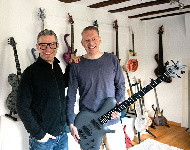Ich habe Jens in seiner Werkstatt im idyllischen Deidesheim an der Weinstraße besucht und ihn zu seinen Prototypen befragt. Mein Kontakt zu Jens entstand vor zwei Jahren über den Bassisten Ulli Salm, der in seiner (vom Guinness Buch der Rekorde bestätigten!) weltweit größten Basssammlung eine stattliche Reihe erlesener Ritter-Bässe besitzt. Diese durfte ich bei Ulli mal antesten und war insbesondere vom R8 sehr angetan, den ich mir kurze Zeit später bei Jens bestellte. Das Foto zeigt uns einen Tag nach der Übergabe meines Basses. Die leckeren Getränke, die wir beim gemeinsamen Abendessen genossen hatten, sieht man zumindest mir noch deutlich an.