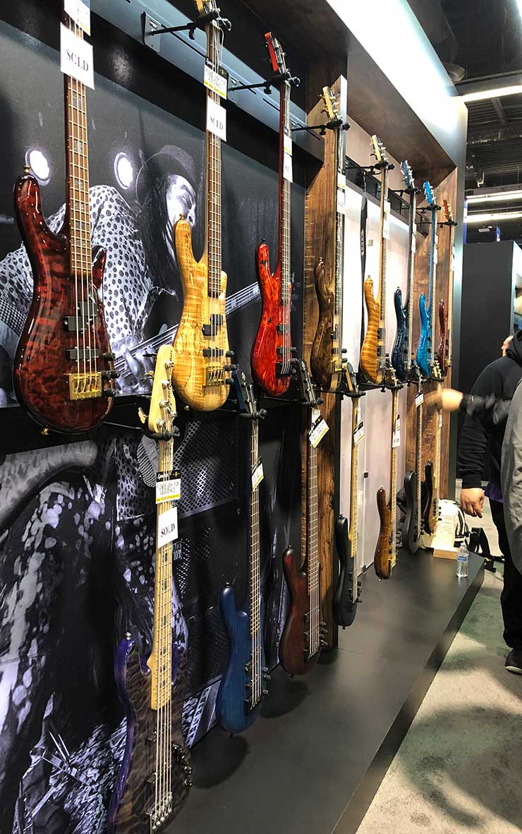 IBANEZ Durch Ideenreichtum konnte sich Ibanez einmal mehr den Pokal des Neuheitenkönigs sichern. Das Foto zeigt Signature -Bässe für den US-Basser Adrian Oropeza von der Band „After The Burial“.