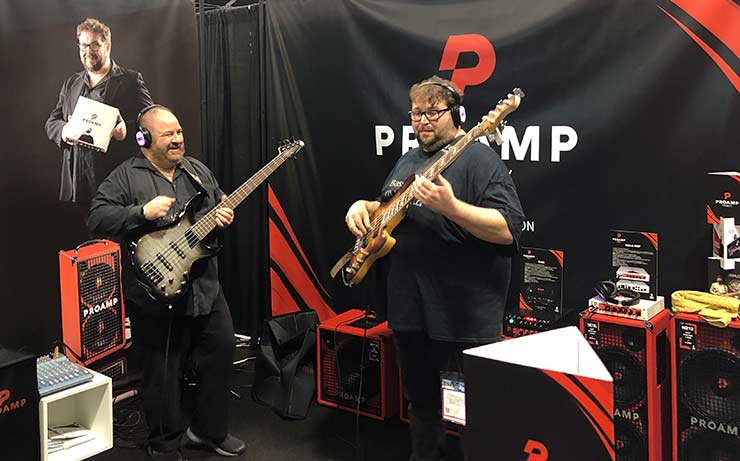 Proamp. Die Erzeugnisse von Proamp aus Italien erkennt man bereits aus der Ferne, sie leuchten einem schwarz/rot entgegen. Auf dem Stand findet offensichtlich eine der berüchtigten NAMM-Sessions statt. Gastgeber ist der italienische Bass-Virtuose Federico Malaman (rechts), den man schon bei FEEL THE BASS bewundern durfte.