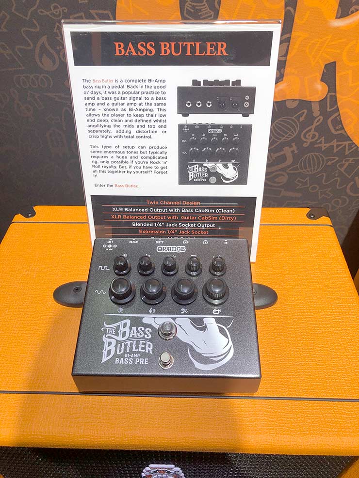 Orange Bass Butler. In längst vergangenen Zeiten war es durchaus üblich, sich den Verstärker mit den Bandkollegen zu teilen. Es war sogar gebräuchlich, wie man auf der Homepage von Orange lesen kann, dass das Bass-Signal auf verschiedene Anlagen verteilt wurde. Der „Bass Butler“ versteht sich als Hommage an jene Zeiten und geht dabei einen modernen Weg als 2-Kanaliger-Preamp. Der cleane Channel läuft im Dauerbetrieb. Nimm man den Zerr-Channel in Betrieb, zieht der Butler die weißen Handschuhe aus und es wird richtig dirty! Das Gerät schreit nach einem Review.