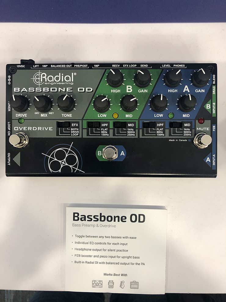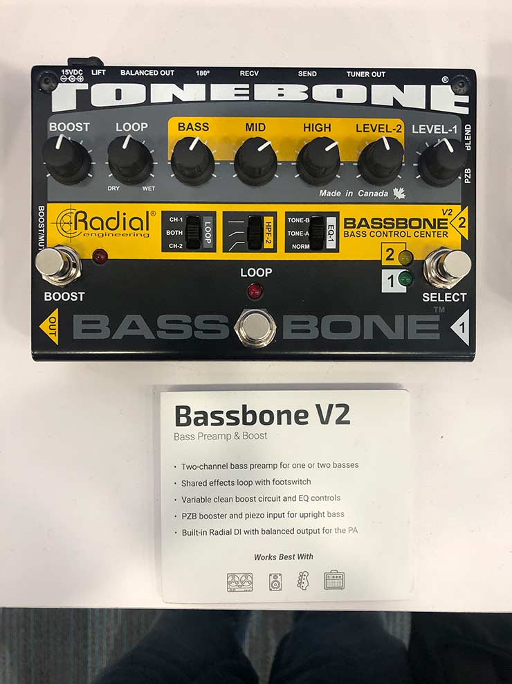 Radial Bassbone V2 Radial Engineering. Aus Vancouver/Kanada waren Radial Engineering angereist, die zwei hübsch aufgemachte zweikanalige Bass Pre-Amps vorstellten. Beide Geräte wirken sehr solide, professionell und bieten vielfältige Möglichkeiten für den Studio- und Livebetrieb.