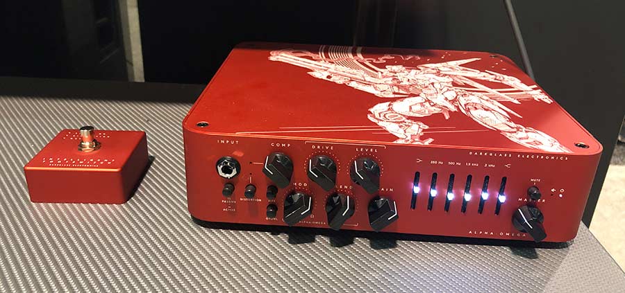 Darkglass. Die Finnen von Darkglass konnten auf dem heiß umkämpften Verstärkermarkt relativ schnell Fuß fassen. Das hippe Design hat den Erfolg bestimmt begünstigt. Das Foto zeigt einen Alpha Omega-Amp mit beleuchteten Schiebereglern, der über eine ausgeklügelte Drive-Sektion verfügt.