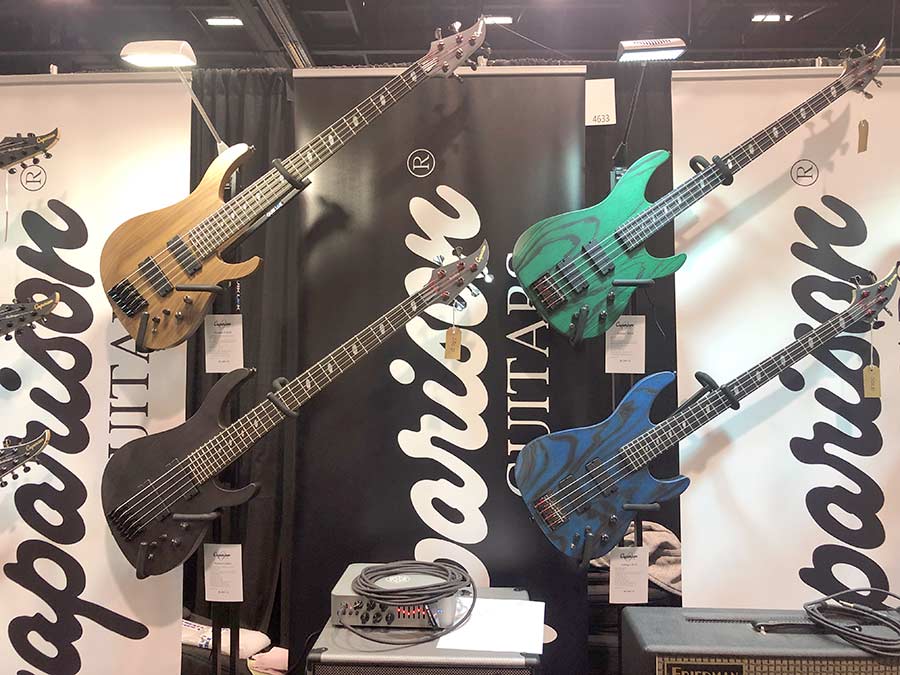 Caparison Guitars. Aus dem fernen Japan waren Caparison Guitars angereist. Besonders markant ist die zipfelige Kopfplatte, Caparison-Bässe verfügen über 27 Bünde und tragen wuchtige Namen wie „Brocken“ oder „Dellinger“. Als besonderen Clou verfügen sie über Soapbars von Fishman.