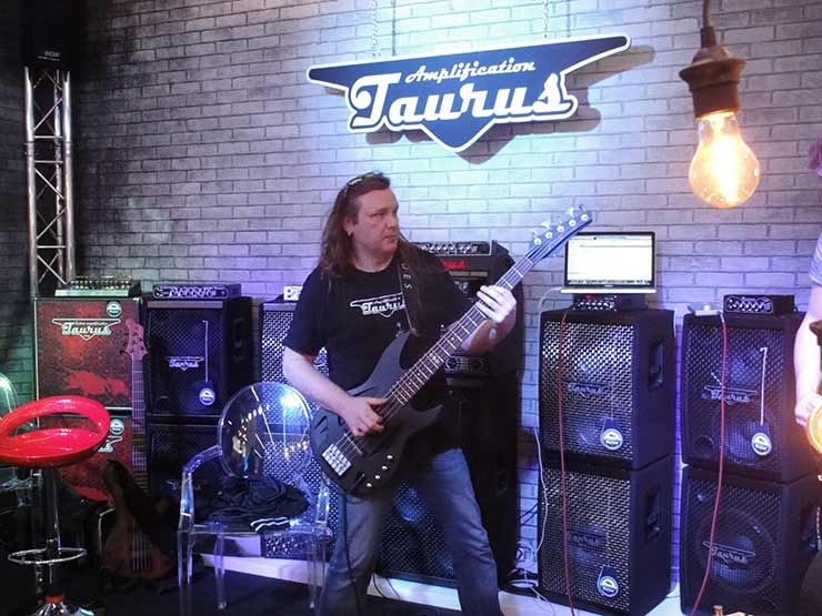 Der Niederländer Barend Courbois (Vengeance, Blind Guardian...) führte seinen Aristides-Bass mehrmals täglich auf dem Stand von Taurus aus – da blieb kein Auge trocken!