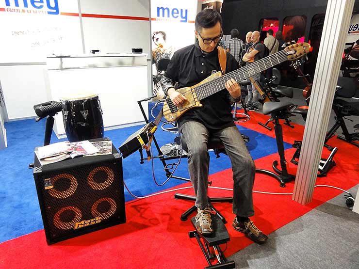 Ein Pionier des multisaitigen Basses bei der Arbeit: Igor Saavedra aus Chile mit seinem achtsaitigen Bass von Prat Basses – wie immer verstärkt über Markbass- Equipment und bequem sitzend auf seinem Signature- Stuhl von Mey Chair Systems aus deutschen Landen.