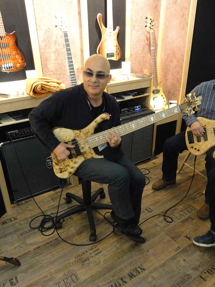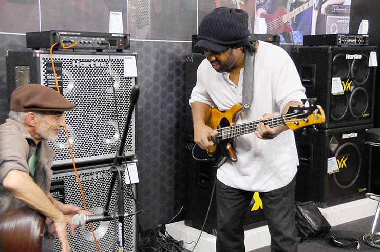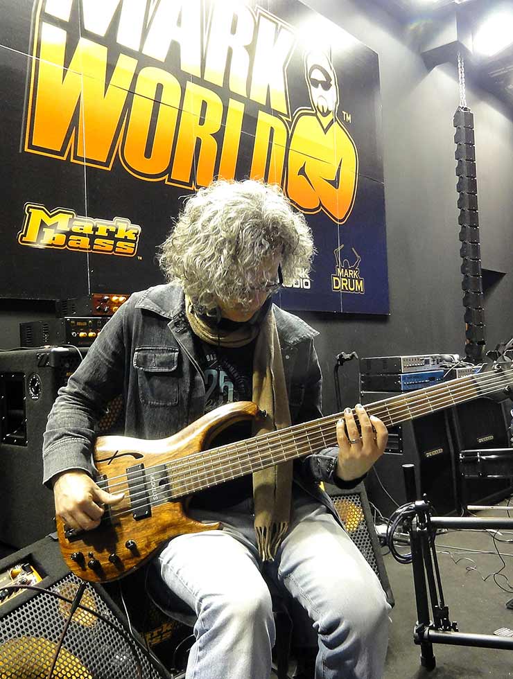 Die französische Basslegende Dominique di Piazza bei einer lockeren Spontan-Session am Marleaux-Messestand. Di Piazza nennt eine schier umwerfend gute Spieltechnik sein Eigen!