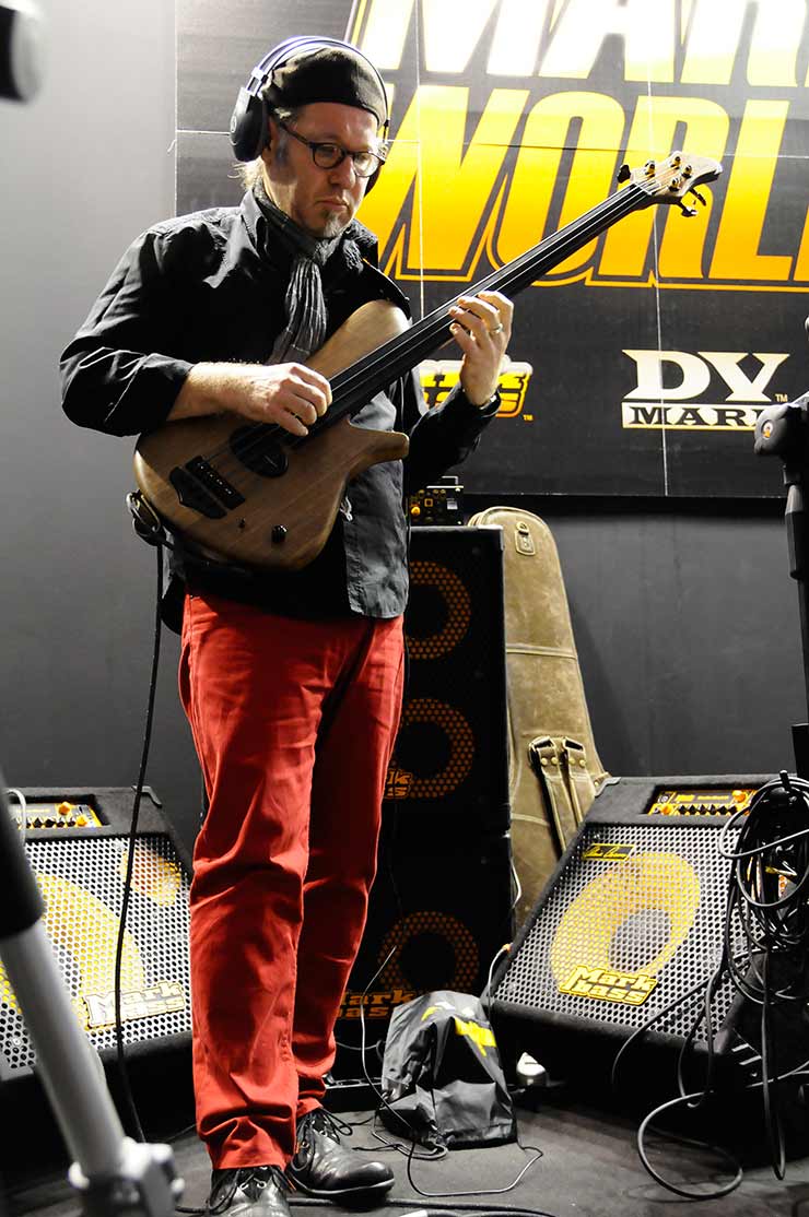 Steve Lawson auf seinem sechssaitigen Modulus-Bass auf dem Markbass-Stand. Sein virtuoser Umgang – nicht nur mit dem Bass, sondern auch mit dem Looper – ist ein Erlebnis!