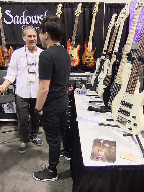 Sadowsky Roger Sadowsky (hier links im Bild) ist ein Szene-Unikat und schon seit 1979 mit seiner Firma in der Bassbranche unterwegs, hier im Gespräch mit einem Kunden aus Japan. Die traditionell gehaltenen Bässe sind alles andere als günstig, aufgrund der erlesenen Holzauswahl allerdings immer wohlklingend. Info: