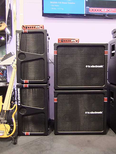 TC Electronic Allein durch das Design hebt sich das Equipment des dänischen Herstellers TC Electronic wohltuend von der Masse ab. Gleich drei hübsche Boxen stellte man in Anaheim vor. Die Cabs hören auf die Namen: K-210 (2 x 10", 400 Watt, 20 kg), K-212 (2 x 12", 400 Watt, 23 kg) und K-410 (4 x 10", 600 Watt, 29 kg). Vor allem sind sie angenehm leicht! Info: