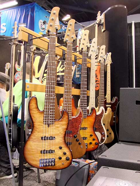 Nordstrand Der US-Pickup-Hersteller Nordstrand hielt eine handverlesene Auswahl erlesener Bässe bereit, mit deren Hilfe man sich vor Ort von der Qualität der Tonabnehmer überzeugen konnte. Unser Augenmerk galt von allem dem „Big Boy 4/21“ von Tino Tedesco aus der Schweiz, dessen Bass vorn links im Bild zu erkennen ist. Ein äußerst feines Instrument der Schweizer Bassmanufaktur, das seinen Weg nach Anaheim gefunden hatte. Info: