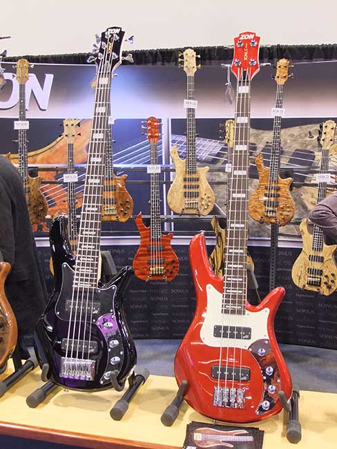 Die Sonus Classic-Bässe von Zon konnte man in Los Angeles zum ersten Mal in Augenschein nehmen. Die Bässe werden aus einem Ahorn-Korpus gebaut und zumeist deckend lackiert, wie man an diesem hübschen Pärchen erkennen kann. Auch hier kommen Aguilar-Parts zum Einsatz. Vor allem die Block-Inlays haben uns sehr gut gefallen.