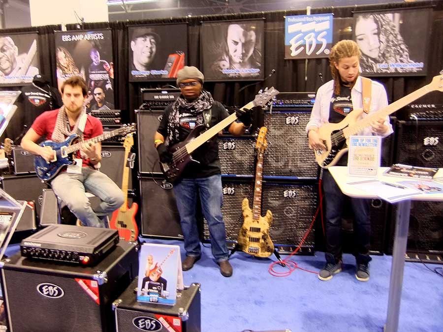 EBS Wer auf einer Messe nach EBS sucht, muss sich nur nach einem Stand umsehen, der zu weiten Teilen in der Farbe blau gehalten ist. EBS-Equipment erfreut sich weltweit großer Beliebtheit, was nicht nur an dem einzigartigen Design sondern auch an dem einzigartigen, wohltemperiertem Klang. In der Bildmitte erkennt man den ehemaligen Bassisten von Joe Zawinul, Etienne Mbappé. Info: