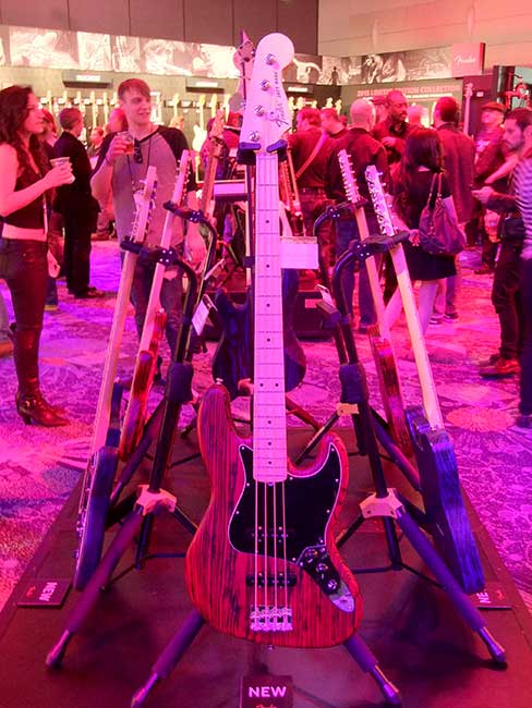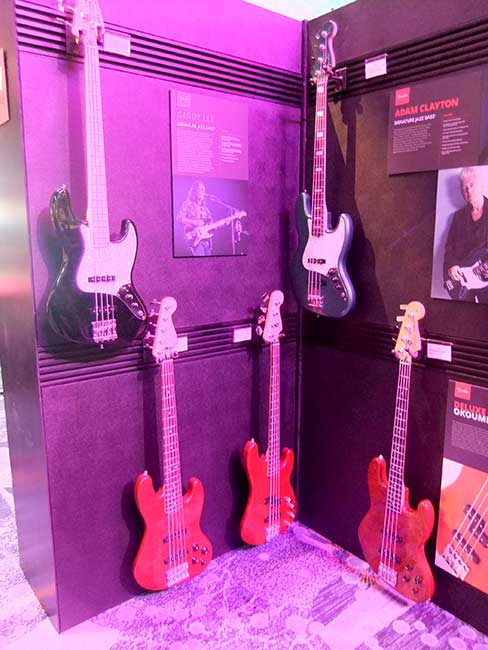 Dieses Foto zeigt gleich fünf Neuheiten: oben links der Geddy Lee Jazz Bass USA und oben rechts der Bass für den USA Jazz Bass für Adam Clayton, bekanntlich der Bassist von U2. Darunter drei aktive Bässe aus der Okoume-Serie. Auch in Sachen Verstärkung war die Company aktiv und stelle den Fender Bassman 500 plus Rumble 410 Box vor.