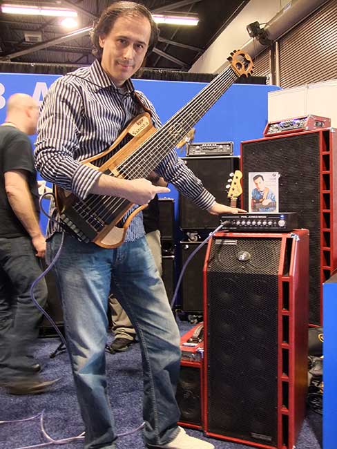 Auf dem Stand von trafen wir den gut gelaunten Brian Bromberg, der es sich nicht nehmen ließ, eines seiner Signature-Modelle in die Hand zu nehmen. Übrigens unterhält der Mann eine eigene Radio- Station, die ununterbrochen Musik von Bassisten für Bassisten spielt! Infos:
