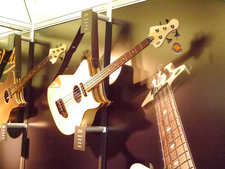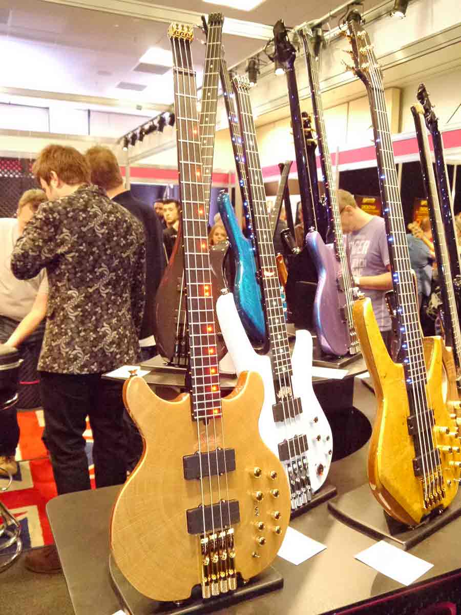 Aus Italien hatte sich Manne Guitars nach London begeben – klanglich sind die Bässe sehr erhaben und setzen sich vor allem durch ein eigenständiges Design wohltuend von den Mitbewerbern ab. Relativ neu ist der als VibraBass bezeichnete Akustik-Bass, den man als zweiten Bass von links sehen kann.