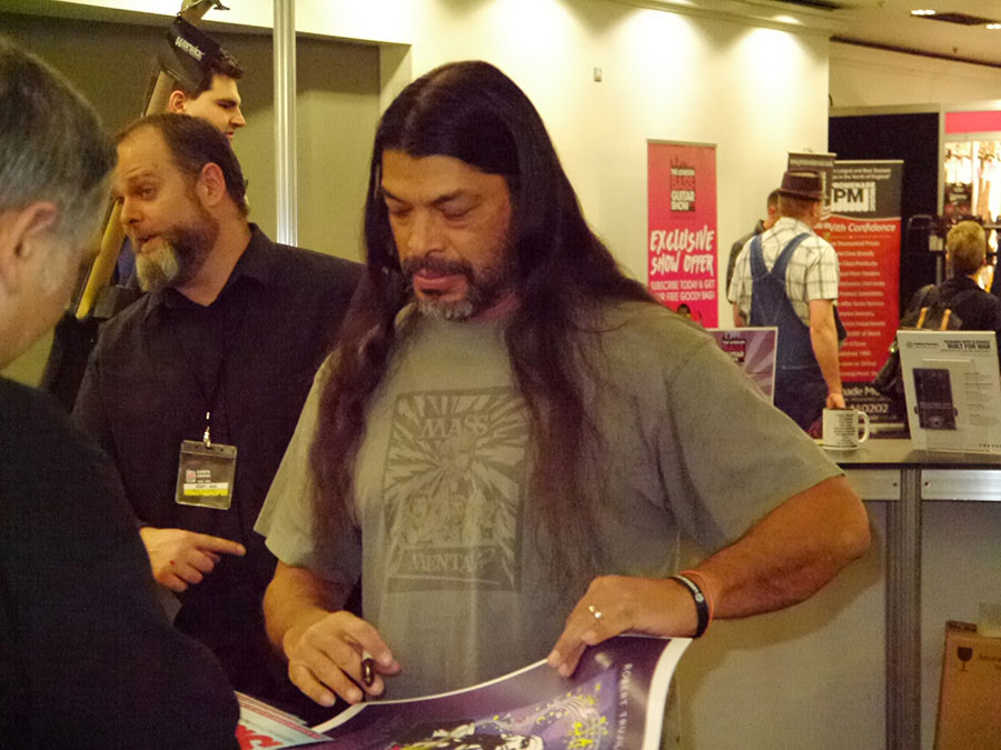 Kaum zu glauben, aber er ist es leibhaftig – Robert Trujillo, der Bassist von Metallica! Die Aufnahme zeigt ihn, wie er geduldig Autogramme gibt. Nicht im Bild zu sehen ist die recht lange Schlange, die ansteht, um einmal Trujillo die Hand zu schütteln.
